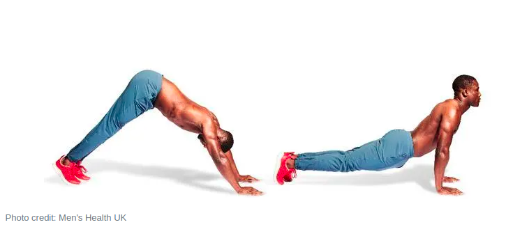 - 2 series de 5 flexiones Hindu con rodillas en el suelo con una pausa de 30 segundos entre cada serie